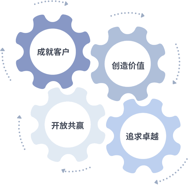 成就客户是一切决策的出发点,,创造价值是衡量所有工作的标准,,,,追求卓越是我们做事做人的态度,,,,开放共赢是我们的格局也是最终的结果。。价值观的齿轮环环相扣,,推动着组织里的每个人不断向前。。。